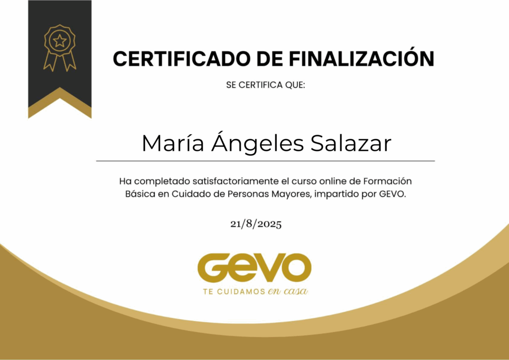 Al terminar el curso recibirás un certificado privado de Academia GEVO. Un documento que demuestra tu preparación, te diferencia de quienes no tienen formación y transmite confianza a las familias y agencias que buscan cuidadoras